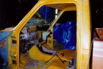 The gutted old cab, stripped of brake booster, steering column, wiper motor, and heater housing.