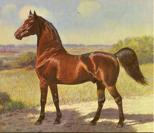 When Figure matured, he stood 14 hands (4 feet 8 inches) at the shoulder--just the right height for a tired man to throw his arm across at the end of a long day. He weighed 950 pounds. He was a dark bay color, with black legs, mane and tail. Figure had a broad forehead, small fine ears, and dark wideset eyes. He had large nostrils set in a small muzzle, a short back set off by a long shoulder and hip. His legs were short, hard, and muscled, with small, well-shaped hooves. His feet stayed sound all his life. He had a fast walk, a low smooth trot, and a fast start at the canter.