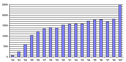 Verticaal staat het aantal megawatt aangegeven. Het cijfer voor 1999 is een schatting dd. 18/12/'98.