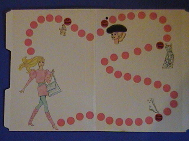 I had a pretty pink file folder which seemed perfect for this game. Since the inside of the folder was white, pink stickers made a nice path. The stickers were from a sticker/coloring book. Note that the path is circular. It really has no beginning and no ending. Although it could be seen as using the large Barbie as a START and END space. This is basically a generic gameboard as there is no skill on the board itself.