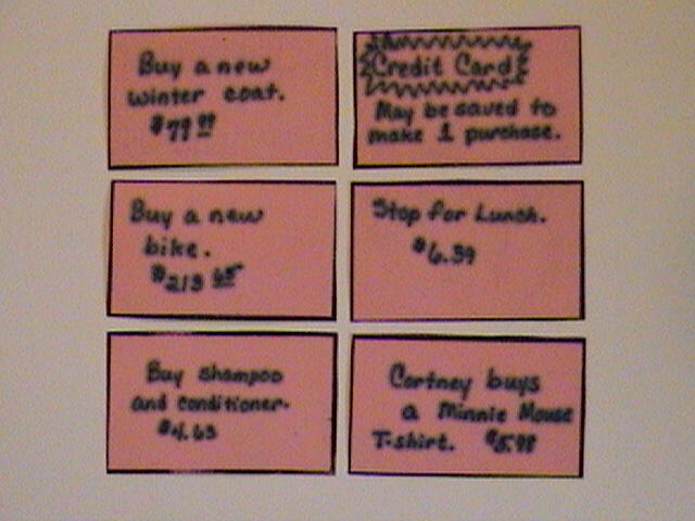 One day I made copies of checks and created a checkbook for each player. This included a register so each player could keep track of their spending. We started each player off with an equal amount in their accounts. As we spent, we wrote and recorded our checks. If a player ran low on money, we allowed them to make a deposit and keep playing. Cortney loved this game. After we played we got out a calculator and checked our balances. I explained about balancing a checkbook. The next time my statement came from the bank she insisted on helping me. I was amazed at how well she understood it.