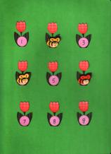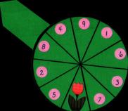 I drew a circle spinner on green heavy weight paper. The spinner has ten segments. The numbers 1-9 are written in a random order. The last segment has a tulip in it. The added piece will have a hole punched in the point. A matching hole will be punched in the filefolder near an edge. Using a brad paper fastener, I will attach the spinner to the folder. This keeps the spinner from being lost, and allows it to just be turned to be used during the game without detaching it.