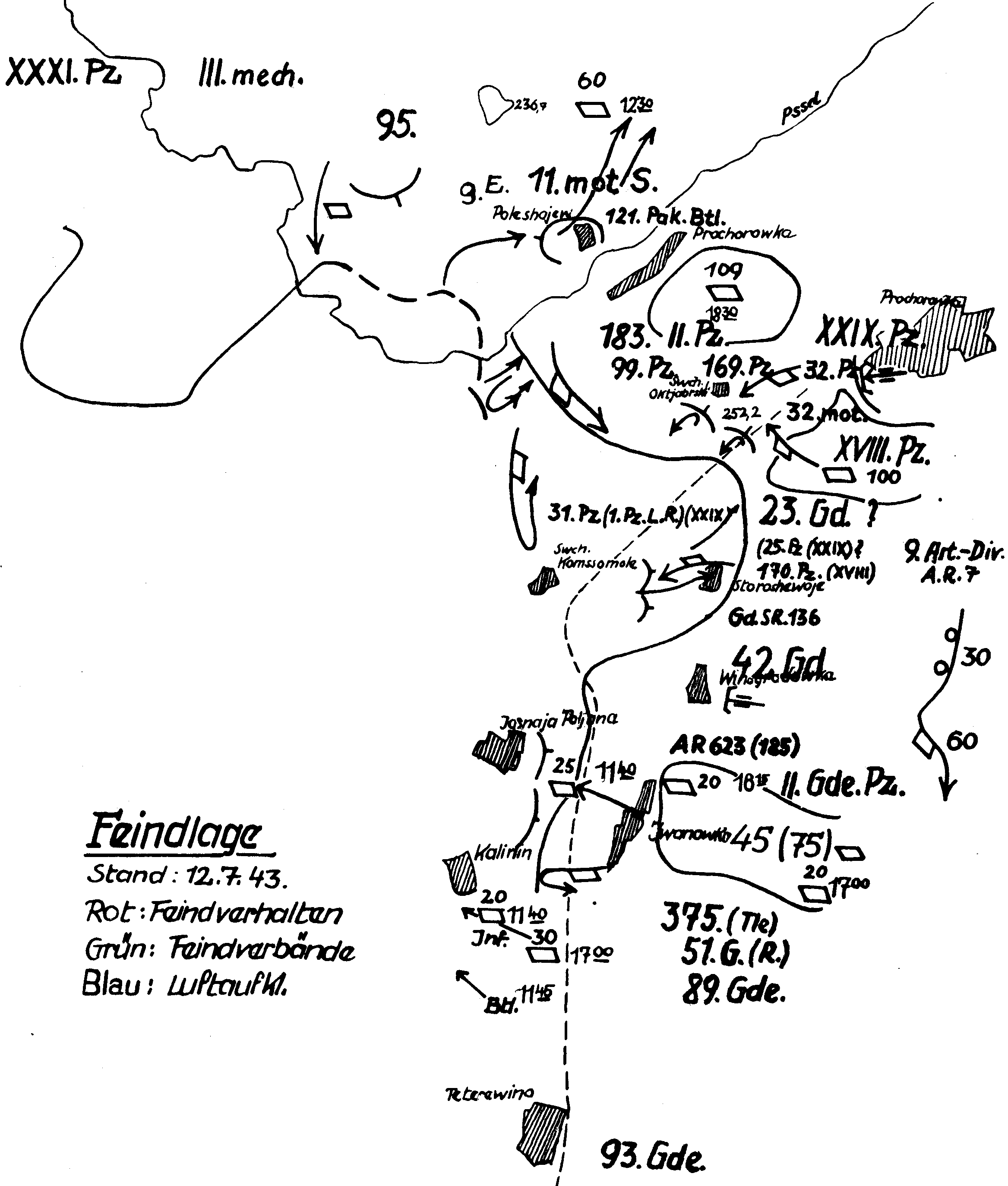 Pro-chorowka sowie westL Werchopemje. Hierzu hat der Feind am heutigen Tage 2 Panzerkorps im Raum Prochorowka neu