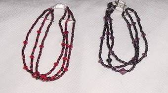 Two bracelets created in March, 2003. I used size 11 seed beads and Austrian crystals. The clasps are Sterling Silver Filigree Rectangular Clasps. One is Black and Red, the other is Black and Purple.