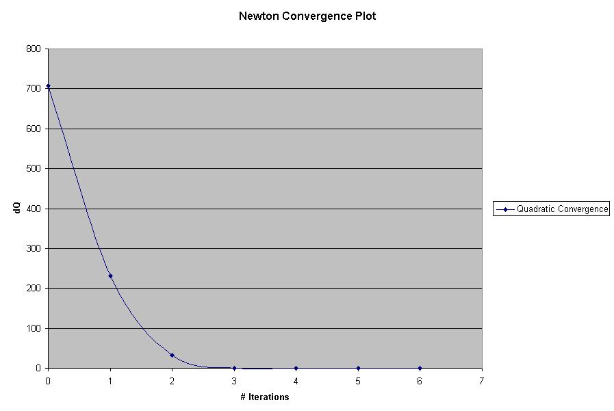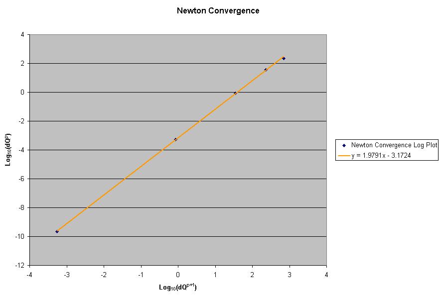 Vs. # of Iterations was plotted to show the quadratic convergence of Newton’s Iteration method. A second plot of log10(dQp+1)
