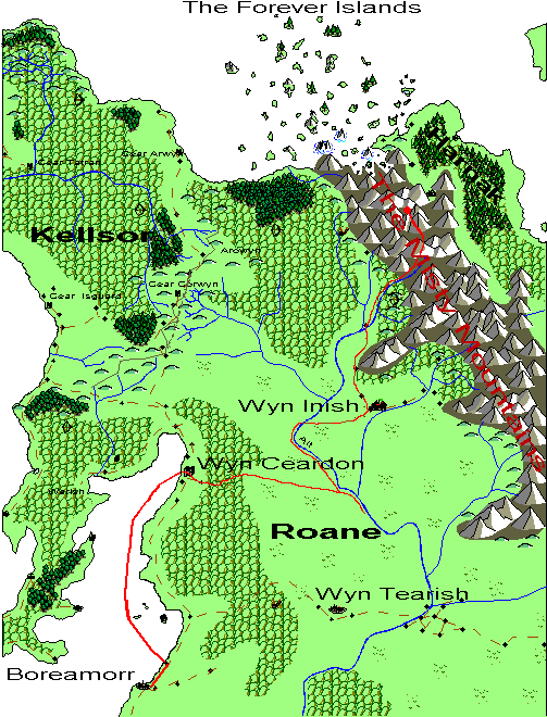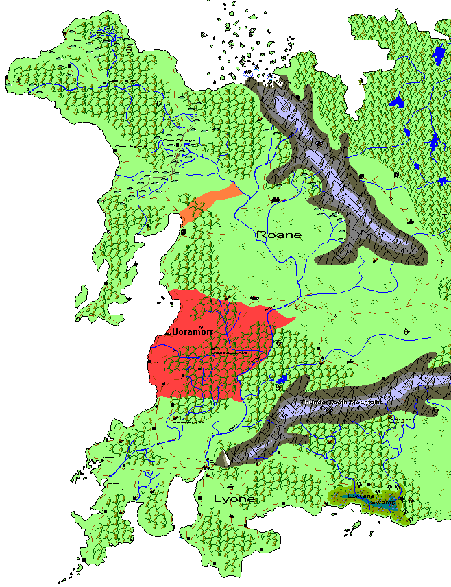 The area in red is controled by Shelleth. The Orange area is where forces have been attacking Roane.