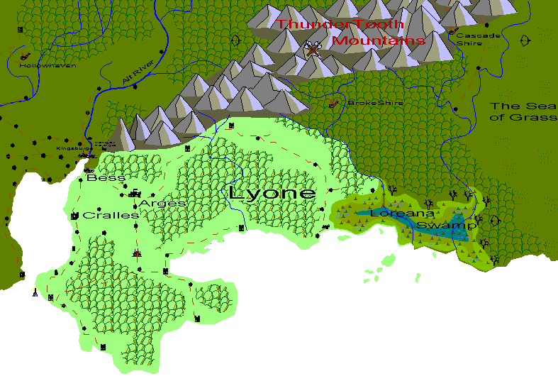 North-east of Lyone is an independent halfling settlements. Outside of the boarders of Lyone, Broke Shire is not subject to the King, but governs itself. This Shire and Cascade Shire, further to the east are both friendly to Lyone and its King.