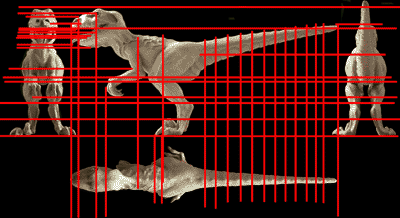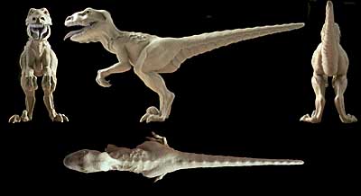 ![]() Creating a 3D Scultpure Dinosaur From the Plasticine Model Next, from the plasticine model I will create a 3D dinosaur. Equipment needed: 1. 35 mm Camera. I used a Nikon F3 camera with a 60 mm AF Micro Nikkor lens.I draw a center line down the center of the model's base in each direction using the length of the model for my determination, then use those lines when setting up the camera so it'll be perfectly centered. Next, I line up the camera with the center of the model, top-to-bottom and view the result in the single-lens relflex viewfinder. A single-lens-reflex camera has a mirrow in the viewfinder which flips out of the way when you take the picture. It allows me to see exactly what the edges will look like so I won't chop off the tail or nose when I take the photo. You now know the drill. First, I'll need to create a side view, top view and front view of the dinosaur. I set two lights on light stands and take rolls of 35 mm film at different F stops and with different placements of the lights. When I set up lights, just as when I set up lights in a 3D Sculpture program, generally one main light goes towards the front and off to one side to the left. Ideally, you'd use three lights. If I had three lights (which I don't) I'd place a second one to the right and put it on less power and the third light would go as a backlight at about a 45 degree angle behind the object. In my case, I use one light as the 'Master' light which I place to the right and set to 240 Watts/Second. The second light, I turn on it's strobe feature so it will sync with the master light and set it at half the Watt/Seconds of the Master light (120 Watt/Seconds). I aim both lights backward, not toward the model, and use reflecting umbrellas which have a reflective interior. This will create softer lighting. I do this with both lights. For the backlight I use a reflecting circle of coated nylon (which is designed for doing reflected backlight) and prop it at a right angle behind my model (you could just use a piece of white mat board). Besides the front, side and top views, I also do a back view which I'll use in the 'Front' viewport when I do it from that angle. I repeat this process, making the right-hand light the Master light and the left one the Slave just so I'll have variety when I make my final choices of which image is best. I also try some images with only one front light and a backlight with no reflected backlight. I later determine that the film I've shot which have two lights and a reflected backlight work best. You should keep a log of each shot you did, what F-Stops you used, and what angles and powers you placed the lights at so later you'll be able to understand which were the best choices you made. After developing the film, I choose which shots best illustrate the contours and scan them into my computer using a Nikon Coolscan III 35 mm scanner. I paste the four images that I've determined to best represent the contours into one image using Photoshop so the tip of the nose of the top view lines up with the tip of the nose in the side view, etc. ![]() Next, I get rid of all perspective differences (such as the great height of the tip of the tail in the back view) using Photoshop. I create red keylines to help me match up the side-view nostril to the front-view, etc. as I've shown you before. Then, I put a guide line down the center of each view, throw away the darker side of each view, and mirror each side of the dinosaur so it's symmetrical. ![]() Notice the slight differences after I've done this. The tail now matches up in the back view with the side view as does the head (which I had to fake completely in the back view by looking at the model, itself). Also note that the feet in the top view have been moved forward to match with the feet in the side view. Although there don't seem to be many differences between these two pictures, you'd be amazed at how many things have to be nudged a little so they will match up view-for-view. THe more work you put into it here, the less problems you'll have when you do the actual 3D sculpture. Since I didn't actually form teeth in my model, I draw teeth on a separate layer of the side-view using an actual scan from a Deinonychus fossil, then scaling, rotating them until they match to the red gumline I chose. ![]() Once I think everything matches up well enough, I crop each view so the pixels exactly come to the edges of the view images. If there is any slight discrepancy between the number of pixels wide in the front view as opposed with the top view, I force the number of pixels to be equal with Photoshop's 'Image->Size' feature. In the end, the side view image is 851 deep x 408 high pixels. ![]() The front view is 213 wide x 408 high pixels (408 matching the 408 of the side-view). ![]() The top view is 213 x 851 pixels (213 matching the 213 of the front view). I also rotate the top image so the nose points downward so it'll be proper when I import it as a backdrop into LightWave. ![]() And, the final 'Back' view will be the same size as the front image. ![]() Next, I'll be creating a dinosaur from these images using LightWave Modeler. |