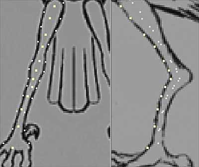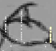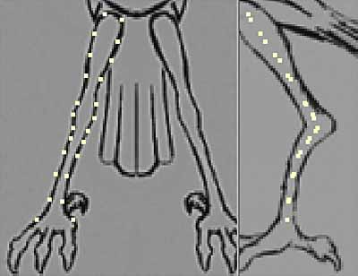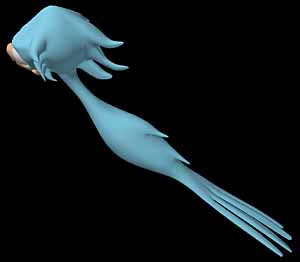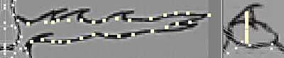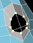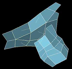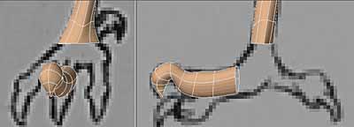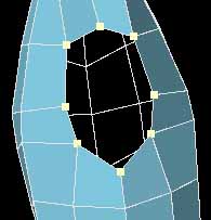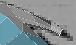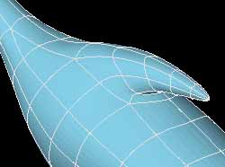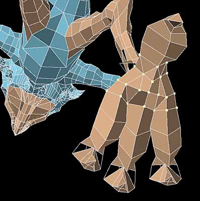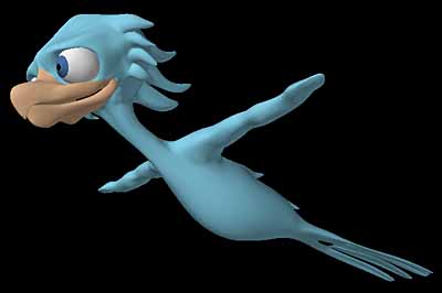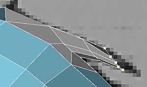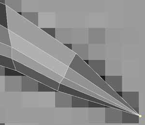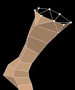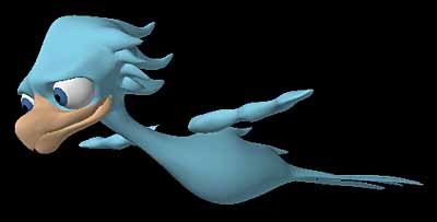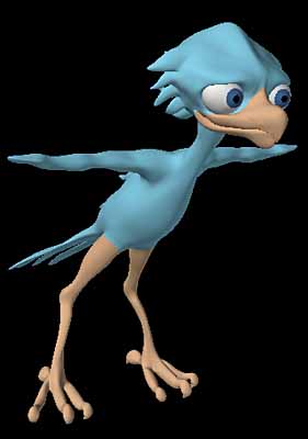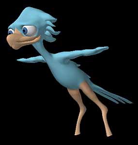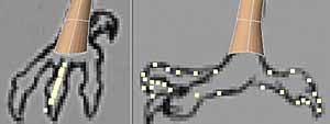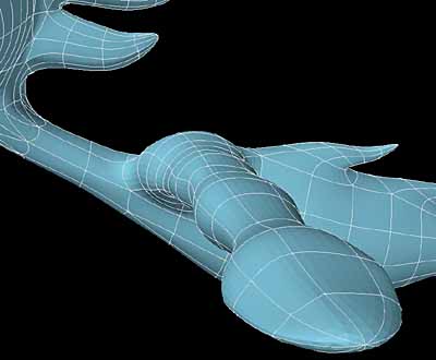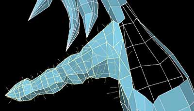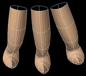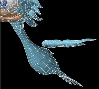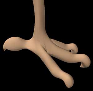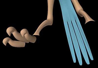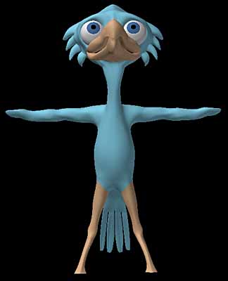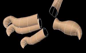 ![]() MODELER, BACK FEATHERS I do the two feathers on Leroy's back as I did the head feathers. Using the 'Right' viewport, I press CTRL-g for 'Select Points' mode, highlight the three back points which correspond with the widest extents of the front feather. I switch to Polygon Select mode with CTRL-h for 'Select Polygons' mode, highlight the four polygons, press 'k' to kill the polygons, CTRL-g for 'Select Points' mode, highlight center point, press DELETE to get rid of the central unused point. I enter 'Drag' mode with CTRL-t and arrange the angle of the back in the 'Perspective' viewport so I can see the 8 points. I turn on 'Symmetry' mode, dragging each point until they're arranged as an oval. ![]() You MUST have Symmetry mode turned on when you do the Extend, however, or the mirrored points won't both move at once when you wish to reposition them. I use SHIFT-h to size the new circle of polygons smaller, 't' to move the new row of points so they align with the side-view, CTRL-t for 'Drag' mode to adjust each point individually. ![]() ![]() Each time that you do 'Extender' while in 'Symmetry' mode, it will forget the proper sequence of the points, and you'll have to exit from Symmetry mode, reselect them in a circle, re-enter Symmetry mode and 'Extender' again. It's a bug in LightWave, I'd say, but this awkward set of steps isn't too hard to do each time. ![]() ![]() ![]() ![]() MODELER, THE SECOND BACK FEATHER I do the same thing to the set of four polygons just below the ones I just did, skipping one row of polygons. If you ever get into a bind where you have either created polygon segments which won't convert to SubSurface mode, try letting it convert the ones it can and while in 'Polygon Select' mode select all polygons and do 'i' for 'Polygon Info' panel. I select all polygons which are SubSurfaced and press the 'Deselect' button. Ensure that the only ones still selected say 'Face', then press DELETE. This will get rid of any offending polygons with less than 3 faces. Also, if at any time you find you've been working NOT IN SYMMETRY MODE, delete one side of the model, do a SHIFT-v to mirror those polygons, then an 'n' to fix it, and click on 'Polygon' mode with your mouse, then in the blank area above it to deselect all polygons (turning off mirror mode). I weld together points which had been on the juncture row of points (except the ones that were on the zero X axis, as those are automatically welded). Once I'm done, Leroy has two back feathers. ![]() MODELER, LEROY'S WINGS I do an 's' to save the object, then 'File->Save Object As...' to start another version which will have wings. I'm now up to 'Leroy_7.lwo' I turn off 'Symmetry' mode and move to the 'Back' viewport. I thoughtfully place points by pressing 'Add Points' mode ('+'), giving three points for each feather so there will be four polygons to create them. I place corresponding points along the bottom of the wing. I move the arm plane in the 'Right' viewport so it lines up to the center of the side-view drawing of the wing. ![]() I create the center line points to be equal distant between the top and bottom points, moving them so they line up with the front of the wing in the side view. ![]() ![]() I do that one more time and position it between the top row and the BACK center row. ![]() However, the mind has a way of putting together 3D points into their respective polygons when the view is rotated. Thus, I use ALT and the mouse to rotate it. I memorize which points belong to which polygons. Once you've got a row started, it becomes easier and easier to see which points belong with which polygons. I again use the 'select each point, clockwise, pressing 'p' to create a polygon' and create the polygons a row at a time. ![]() I turn on SubSurface mode to see what it looks like, using CTRL-t to adjust the vertices. ![]() Once half of the wing is done, it is easier to hide the half of the wing that has polygons. I also hide the body by selecting one polygon, pressing ']' to 'Select Connected' and pressing '-' to hide them while in 'Polygon Select' mode. After all polygons are connected I start modeling the arm in the 'Perspective' viewport until I'm pleased with the shape. I select the wing, press 'SHIFT-v' to mirror it, 'n' to set it and deselect all polygons. I enter 'SubSurface' mode to view it. ![]() MODELER, LEROY'S SHOULDERS At the moment, Leroy's arms are way above his body. I could drop the wings down from what my drawing shows, but instead I will create shoulders which feel right with the positioning of the wings. I'll figure that I wanted that humpbacked shape and that my initial instincts were right. I delete the mirrored arm, turn off SubSurface mode, and see what I'll have to do to match up the wing to the body. I save the object with 's', then 'File->Save Object As...' and bump the number. Ensuring that SubSurface mode is turned off, I hide all polygons that aren't associated with the arm connection and body where the shoulder will attach by selecting them and pressing '-' while in 'Polygon Select' mode with those polygons selected. I highlight the six polygons which I'll remove in order to attach to the body to the wing. That will leave 7 points on the body and 8 on the wing to attach, which should do nicely. I'll just have to split a polygon on the body into three triangles, thus creating one more point. ![]() I select that center point and one back point and do a 'Split' (CTRL-L), select the center point and the other back point and do a 'Split' (Creating three triangles in place of the one polygon). I do CTRL-t to 'Drag' the corresponding points to where they will attach, leaving one polygon row between the points. ![]() ![]() I re-assign them to the 'Head' Surface Name by pressing 'q' and selecting 'Head' from the drop-down menu (which removes those polygons from the 'Upper Beak' designation). ![]() MODELER, MIRRORING WING & SHOULDER I delete all polygons which are no longer symmetrical (a polygon won't 