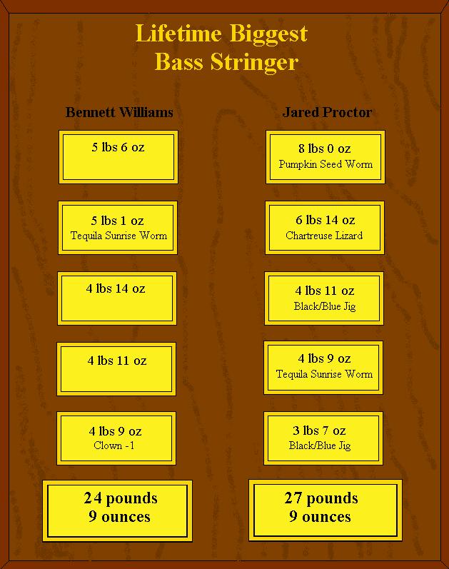 The lifetime biggest stringer competition began in March 2001. In order to increase your stringer weight you must catch a fish bigger than the smallest fish on your stringer. Only fish that caught by rod, reel, line, and lure (only artificial lures) will be accepted.