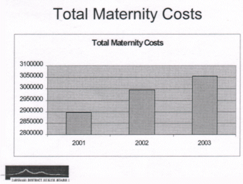 Mr Simpson believes that the total maternity costs are rising. However, the "y-axis" (cost) of the graph he presents does not start at zero (which gives the impression of a much greater difference than is actually present). When one looks at the figures, the costs have gone from around $2,900,000 in 2001 to $3,000,000 in 2002 (a 3.5% increase) to approximately $3,050,000 in 2003 (a 1.7% increase), neither figure exceeding the annual increase in government funding to the TDHB and both approximating the CPI. Therefore contrary to his claim, maternity costs are fairly static, allowing for inflation! Furthermore, the "Total Maternity Costs" given appear to include secondary as well as primary costs, as the average annual primary "revenue provided" as listed on the TDHB website is $1.7 million [12]. This is an astounding misuse of figures to suggest to the Board and the public that a problem exists when it doesn't.
