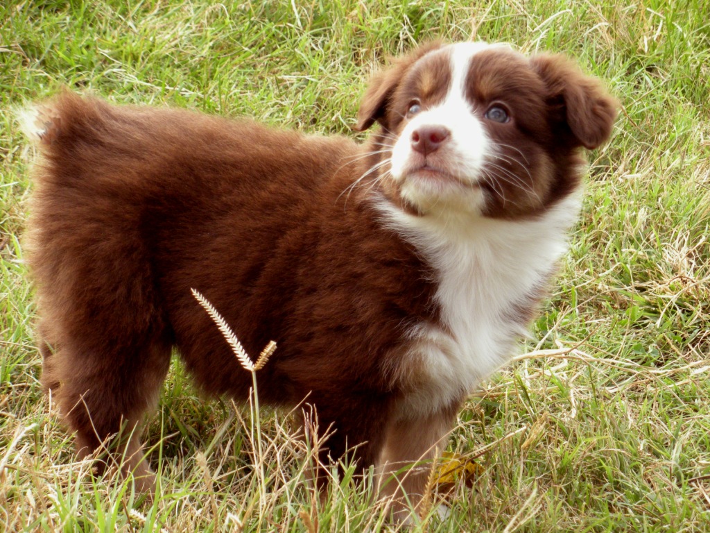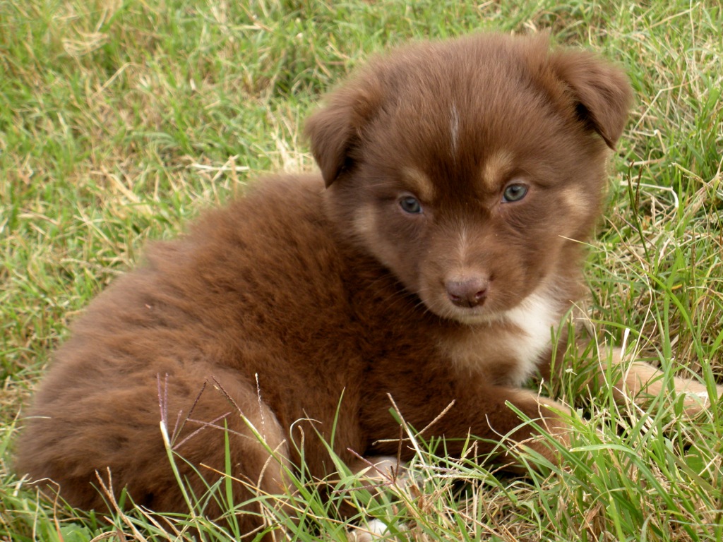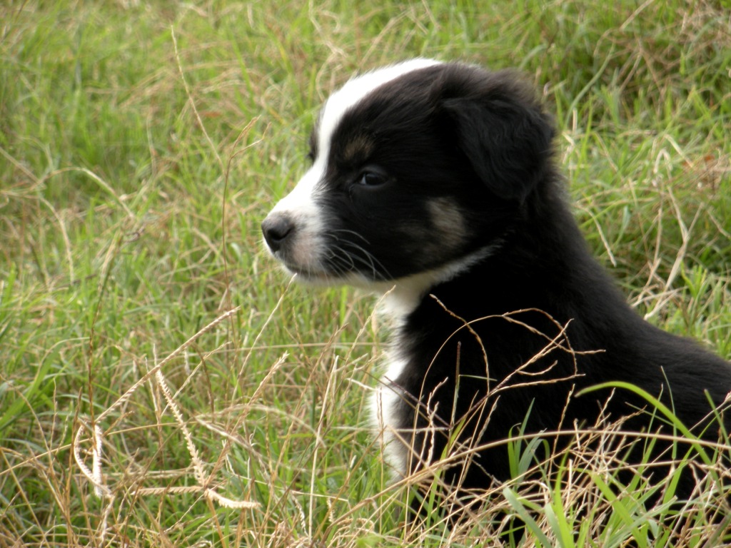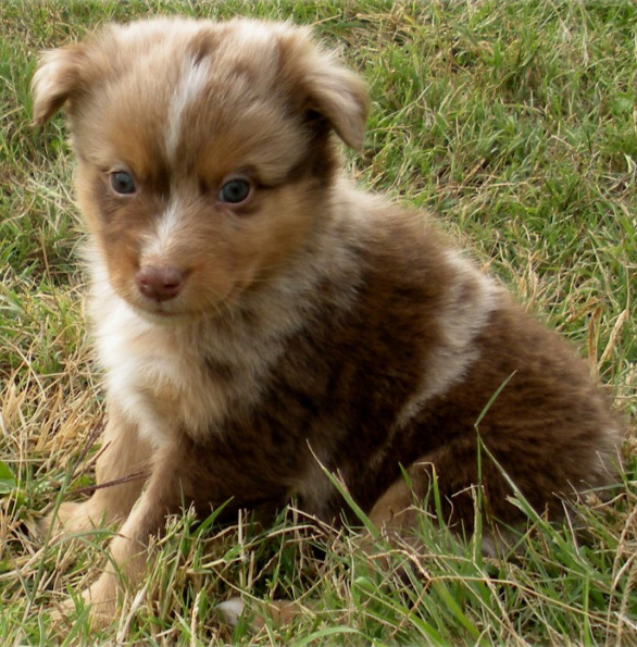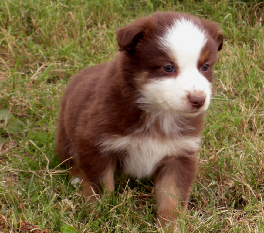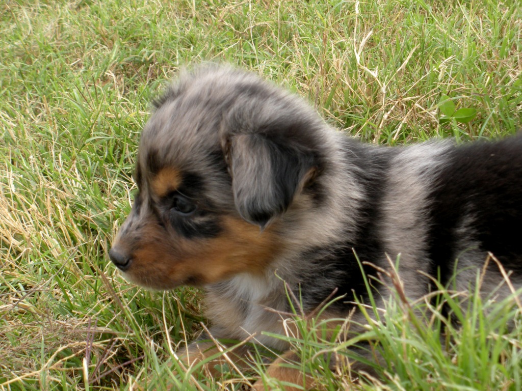 Here are the two red females from this litter. They are both really nice girls. The first girl has a really cute blaze on her face that is slightly off-center, giving her an adorable asymetric look. She is more than willing to engage in a rough-and-tumble play-fight, but also thoroughly enjoys taking a nap in the few rays of sunshine that have managed to sneak through the clouds lately. The second red tri has very little white on her. She is currently the most independent and active puppy in this litter. I have temporarily nicknamed her "Dora the Explorer" because of her tendency to go sight-seeing on her play-outings. "Dora" has found a great home with a farmer in our area who loves the last dog he got from us so much he decided he would get a second.