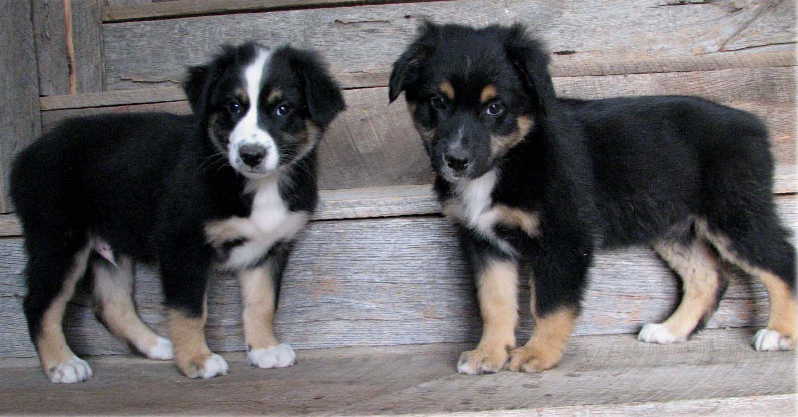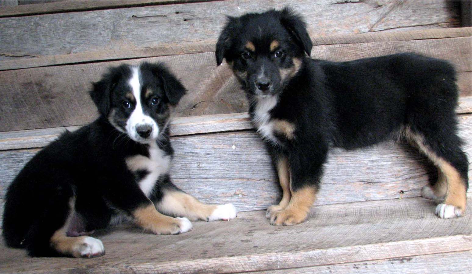 Here are the two black tri males from this litter. The black tri male on the right of these pictures was, in our humble opinion, the second best male in the in the litter overall, and the male we would have picked for ourselves if we were willing to take on another boy right now. He was also the last puppy to find his permanent home from this litter. It just goes to show you that everyone is looking for something a little different when they pick their four-legged companion. He has a steady and determined manner about him. He has been one of the most independent and athletic of the litter from the time he was born, but he still is attentive during one-on-one time. From the beginning, this boy was always one of our top two picks out of the litter for someone looking for a good working dog. Consequently, we are really excited that he is now living with a rodeo family and their very smart and confident barrel-racing daughter. We hope that he will live up to our expectations of him both as a buddy and as a stock dog. The black tri with the pretty white trim (shown on the left of both photos) has joined his sister with a lovely family in the Ozarks. He is a very people-oriented, playful fellow, who struck me as a dog that will bond closely to his owners and love sharing outdoor adventures with them.