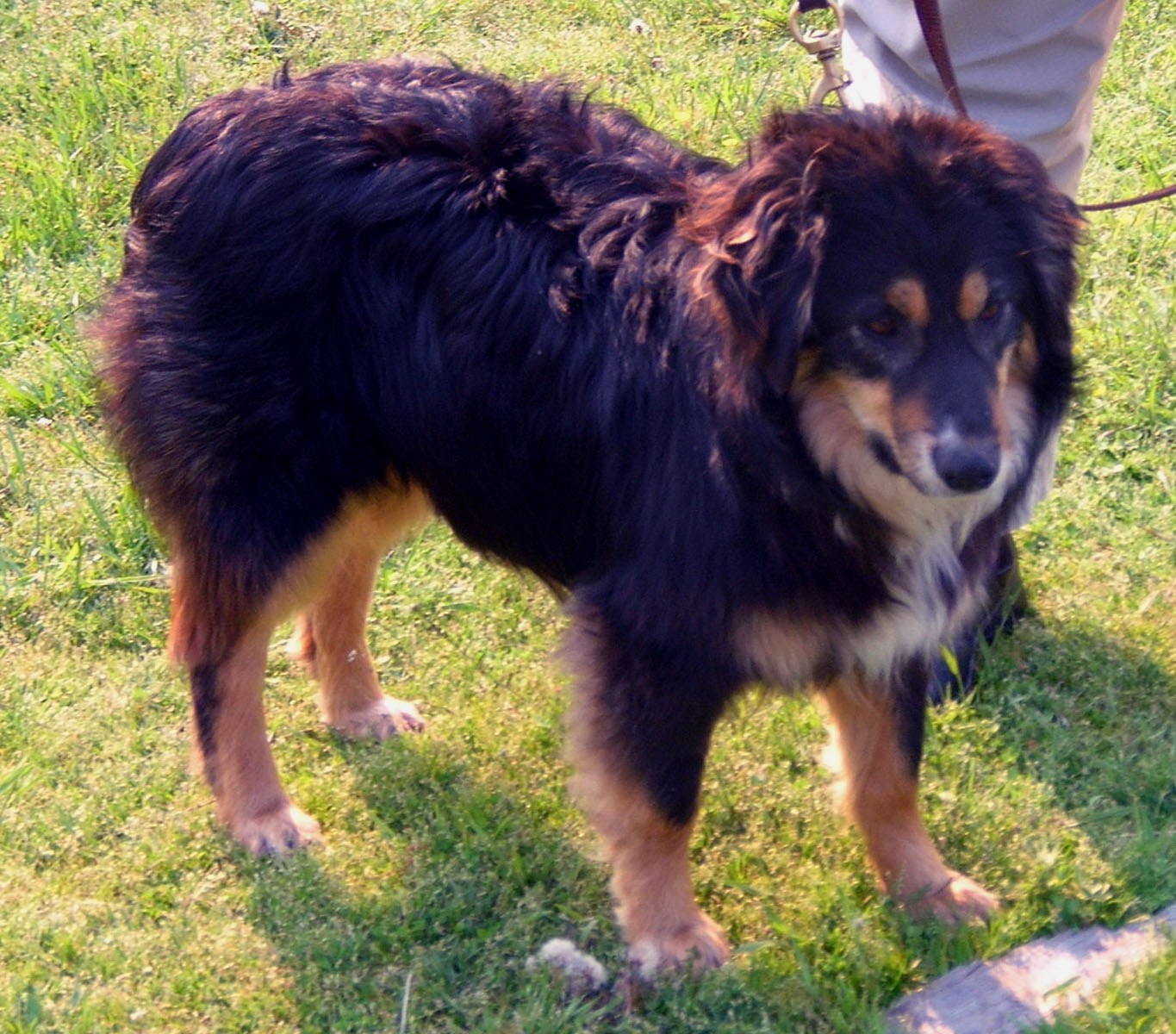 Slash V Charcoal, aka "Char", is out of Slash V Steel Smoke, aka "Smokey". Char is a very laid-back dog, has excellent manners, and listens well. We waited along time to get a Slash V dog, and he has more than met our expectations. He decided early on that his place was by Rose Marie's side, and hasn't moved from it yet. He is aloof, but polite around strangers; he has never been aggressive to a person in our presence but he does not run up to strangers and try to lick them to death either. From correspondence with his breeder, we know that some of his siblings are slightly protective of their family and would definately stop someone from breaking into the house. However, Char doesn't have this tendency. Since he has matured, he is equally polite and friendly to everyone even people who we think might be staking our place out to improve their wealth at our expense. Ahh well, you either get "slightly protective so needs lots of socialization" or "happy to show the burglers around the house for a back rub." And Char is definately always up for a back rub if you politely offer. He has great manners in the house and spends many winter nights as a toe warmer while we watch television. He is a favorite of our housecats and used to be our gray kitty's favorite toy when he was young (none of his other toys moved when you jumped on their heads!). In conformation, he is well balanced, has a strong topline, and moves well. He is not overly large, but has a solid bone structure. Char has been worked more on goats than cattle at this point in time, but has alot of natural presence (probably more eye than any other dog we own), bites low and only when required, and very seldom barks while working. He is a nice quiet worker that doesn't not get the animals overly excited. He has lots of presence without stirring the animals into a ruckus. Rose Marie is very excited about working with him more now that she has retired from teaching. She thinks he's the best working dog we own right now. We have kept two pups from Char for ourselves (both out of Gypsy Rose) and have remained in contact with pups from his two other litters. We have been very impressed with the type of dogs he has produced. His pups are fast eager learners, loyal to their family, "thinkers", and calm, directed working dogs. Here is a link to his last litter from one of our females: >>Click to see Char's Fall 2009 Litter << Dora, the solid red female pictured lieing down in the grass at six weeks, is now owned by a very nice man who lives close to us. He drops in with Dora fairly often to let us visit and give us updates. At four months, Dora apparently took it upon herself to bring the cows before her owner got home from work when they broke through a hole in the fence into a neighbor's pasture. He decided it was time for more structured training with her after that adventure and she has proven to a be an excellent cowdog.