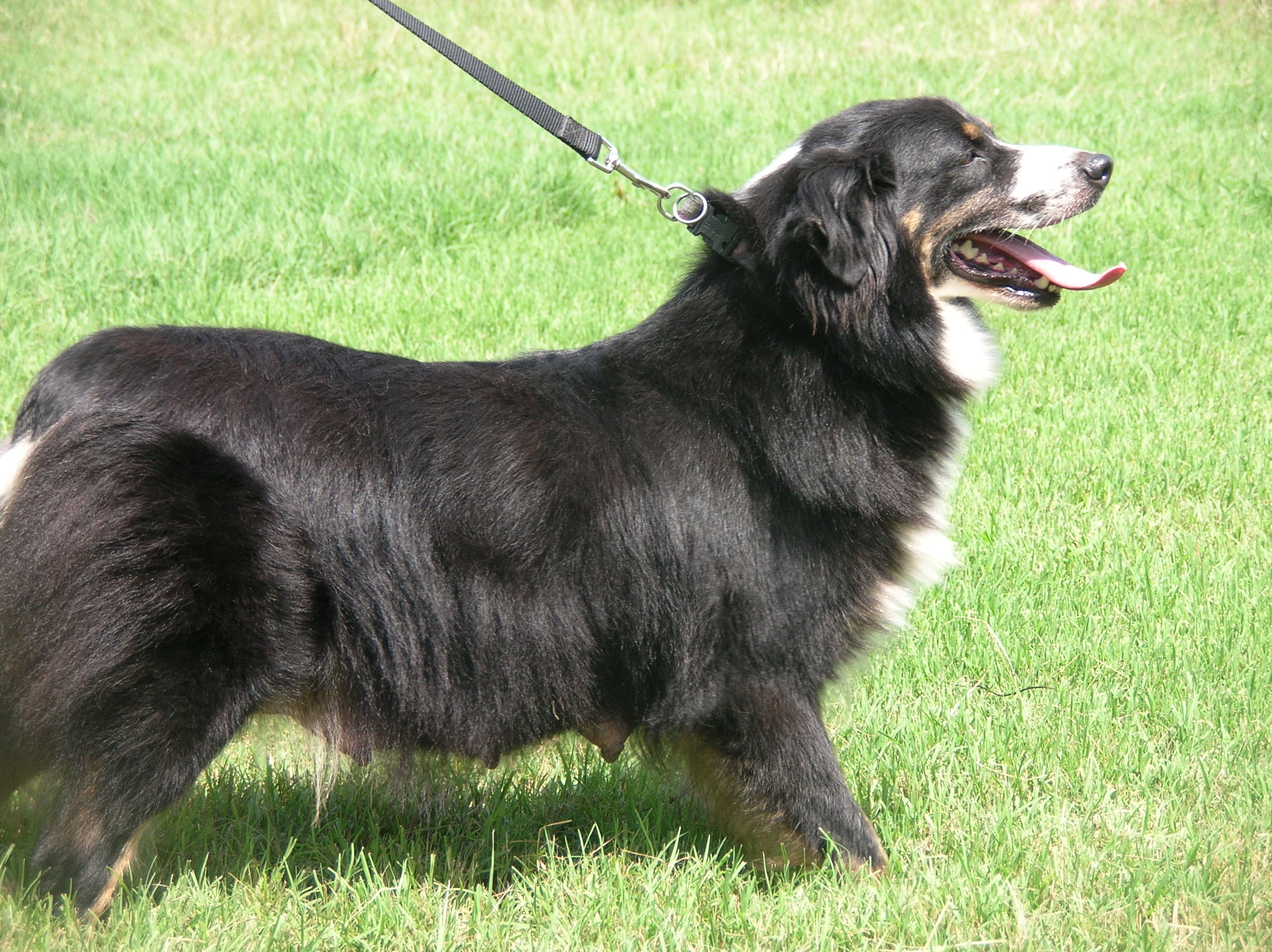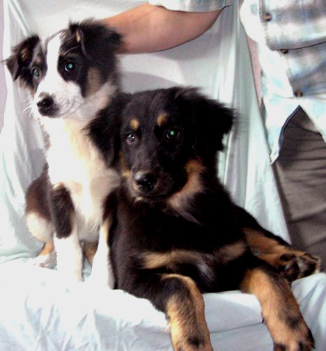 The black tri male, who is shown to the right of his black tri sister in the pictures above, has found a permanent home on a farm in central Arkansas. He will be strong fellow both physically and in temperament. He has already shown in interest in working stock, but quickly comes back to the handler when called. While he is still too young to be used on big stock, he is very assertive boy when exposed to sheep and will likely be a very nice cattle dog. He is calm and quiet in the house and adjusts to new situations without any fuss. He takes to baths, tumbles by an overexuberant 11-year-old, and trips in the car without the same calm demeanor. He has a nice conformation with a strong topline and carries himself well.