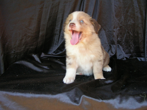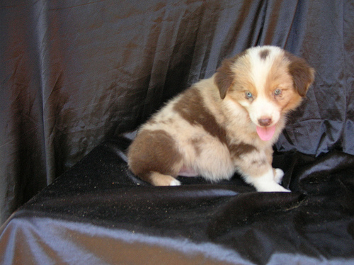This is a red merle female who is by far the most social of the litter. She has two bright blue eyes to go with her striking colors. She has been temporarily dubbed "Daisy" due to her overly happy personality. Daisy has found a permanent home in Louisana. We wish her and her new owner the best!