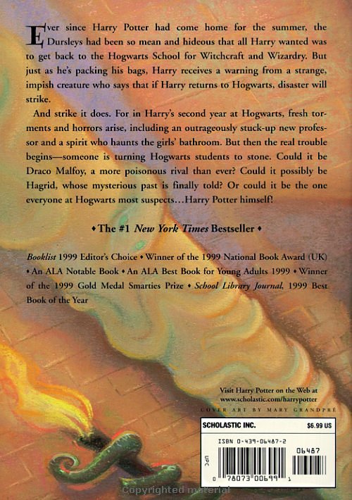 Book Jacket: The Dursleys were so mean and hideous that summer that all Harry Potter wanted was to get back to the Hogwarts School for Witchcraft and Wizardry. But just as he's packing his bags, Harry recieves a warning from a strange impish creature named Dobby who says that if Harry Potter returns to Hogwarts, disaster will strike. And strike it does. For in Harry's second year at Hogwarts, fresh torments and horrors arise, including an outrageously stuck-up new professor , Gilderoy Lockhart, a spirit named Moaning Myrtle who haunts the girls' bathroom, and the unwanted attentions of Ron Weasley's younger sister, Ginny. But each of these seem minor annoyances when the real trouble begins, and someone-or something-starts turning Hogwarts students to stone. Could it be Draco Malfoy, a more poisonous rival than ever? Could it possibly be Hagrid, whose mysterious past is finally told? Or could it be the one everyone at Hogwarts most suspects... Harry Potter himself!