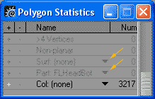 So, except for the difference in where you might find the places where you change a Surface or Part name, and the place where you redefine a surface or part name, there are more similarities than differences between Parts and Surfaces. SKELEGON NAMES AS PARTS You'll be dealing with 'Skelegons' in later tutorials. Skelegons are a way to build a bone structure which resides within an object. Bones used to have to be built separately from an object in the Layout program (and bones still can be done that way), but it can be very handy to keep your bone structure integral with the object, itself. Skelegon names are actually part names. SELECTING PARTS OR SURFACES So, recounting what you learned, one of the reasons you might wish to give a surface name to polygons is you can easily re-select that surface just by using the surface name. In the same manner, a part name can be re-selected. You can reselect either a part or a surface name by entering the 'Polygon Select' mode by pressing CTRL-g, pressing 'w' to bring up the 'Polygon Statistics' panel. At the bottom of the list, just as with surfaces, just below where it says 'Surf:' it says 'Part:'. If you click on the black arrow which points downward (pointed to by the arrows in this illustration), a menu will appear which lists all surface or part names.