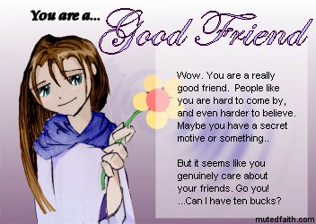 OMG...i do not think i am a good friend....i took this test over and over as honest as i could be and o_O;;; amazingly im a good friend! i feel sooo much better now! ^_~ |