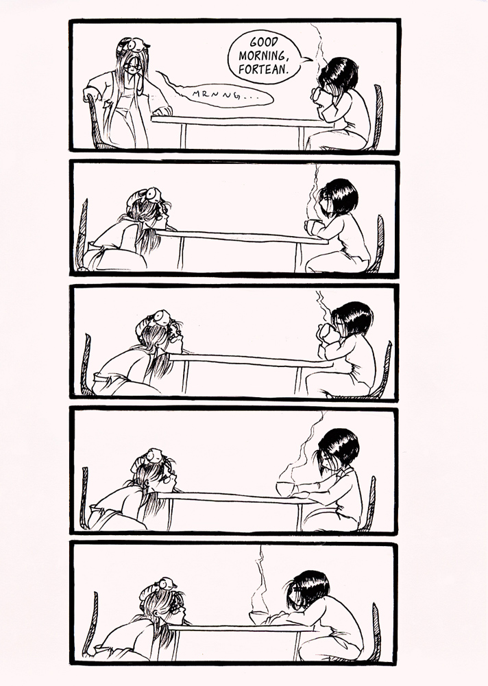 This may be one of my favorite pages. i just like my visual timing... lookit it go. by biggest problem? how to spell 14's name... i mean, i didn't just want to introduce her as a number. That's so 'Voyager' (oh 7of9... what would we do without you?). i went through so many crazy spellings. then i finally setteled on Fortean. like so many things, it seemed like a good idea at the time.