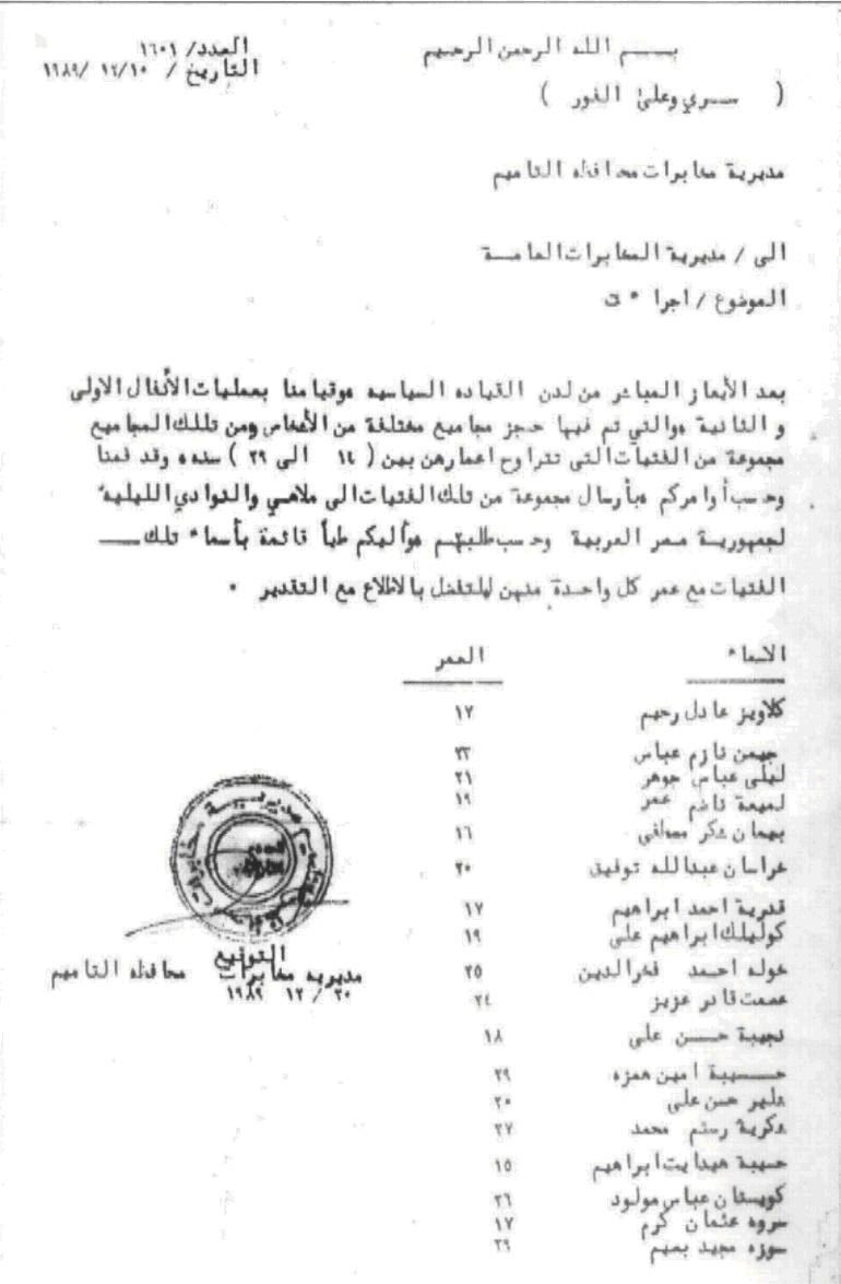 ادناه الوثیقه الدامغه باستلام مجموعه من الشابات الکوردیات من قبل السلطات المصریه وهن فی مقتبل الاعمار او حتی القاصرات، لذلك انها لیست جریمه انسانیه فقط وانما هی جرائم محرمه في قانون الدولی كاتبة وصحفية كردية کندا April 5, 2006 تنازل الرئيس المصري حسني مبارك لصالح إتحاد الشيعة وحوزتهم الدينية ومرشدهم المتمثل من السيد علي حسين السيستاني ، تمکنوا الشيعة بإتحد کلمتهم من القاعدة وإنتهائآ القادة ،وهذه عبرة لنا إذا تجمع کلمتنا وبمساندة من قادتنا ومرجعيتنا المتمثل بالأخ الرئيس الکوردستان مسعود مصطفی البارزاني والعم العزيزمام جلال رئيس جمهورية الرعب وآلآنفال \ وإلا فاليخرج ألاف المظاهرات في الخارج هذا جيد لکن الطواغيت لايهمهم جماهرهم وکيف بغير مواطنيهم وسکوت عن الحق شيطان أخرس بارزان علي 2006/04/18
