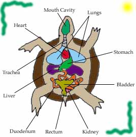A turtle is in the chelonian family, which means their bodies are protected by shells. Above you see an under view of the turtle, with an outline of its shell around it. These shells are made up of plastron (this protects the underbelly and the carapace, which covers the back). The internal anatomy of a creature that is chelonian is similar to other vertabrates. Between a pair of lungs lies a three-chambered heart, and the gut and bladder lead to a section of the animal called a cloaca. This means; "sewer".