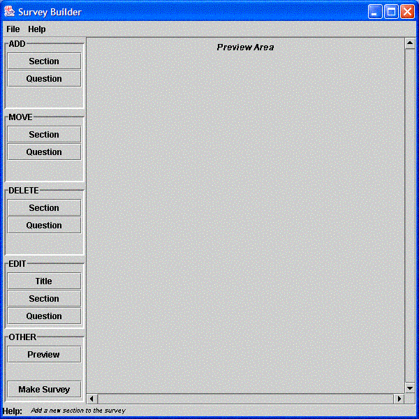 | Upon opening the Survey Builder application, the user will see the "Main Screen". None of the buttons will be enabled until the user selects "File" on the menubar and chooses an action. If new, open, or delete is chosen, then a small screen will appear, prompting the user for the appropriate input. Once the user has named a new survey or opened an existing one, the main screen will display the text of the survey on the right portion of the screen, and the buttons on the left panel will become enabled. Each button will have a small screen associated with it that allows the user to make the appropriate additions and changes. After the action on the small screen is done, the main screen will become the focus again. | |||