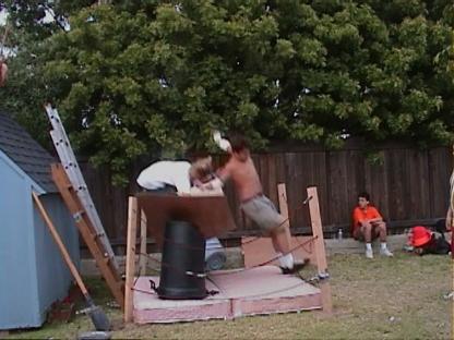 The Beast is piledriving Insaniac onto a trashcan at Matress Mayhem '00.