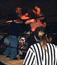 Jomott recovers in the ring after New Jack attacked him. Notice the trash can full of weapons that came into play!
