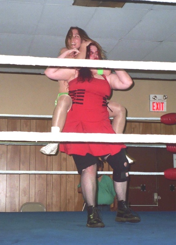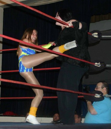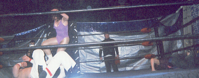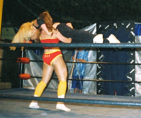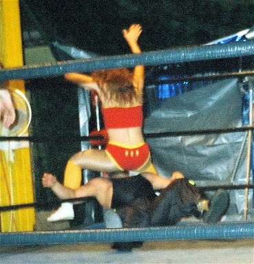 This week, it's action from the recent WWW event, where I took on Cindy Rogers for a number one contender's spot. Here, Cindy is about to receive a big leg drop, courtesy of me!