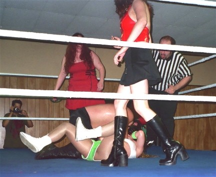 I know a lot of you have seen pictures from this match over at EPWwrestling.com, but they're a bit dark, so here's a little brighter view of my match with Amber. Here, she's caught upside down in the corner, and I'm admiring my boot!
