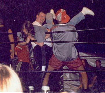 Well, as many of you know, today (Sept 6) is my birthday, so I hope I have a good time today. However, I wasn't having a very good time when this picture was taken. It more action from NECW's Birthday Bash. Here, Hayley Skye has hit a sidewalk slam on me, that knocked the wind right out of me, much to the apparent delight of the fan behind her!