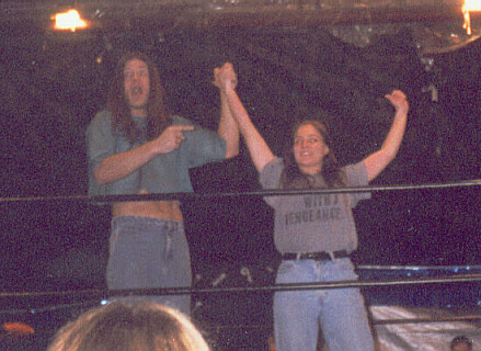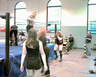 This week brings action from the NECW Birthday Bash. Here I'm in the ring with Ariel. I was trying to see if she was ok, but for some reason the referee thought I was choking her, and made me back up. Party pooper! ![]() | ![]() |