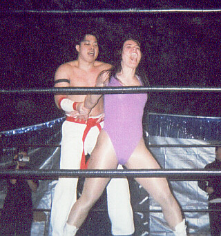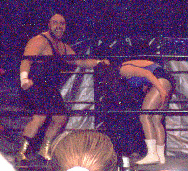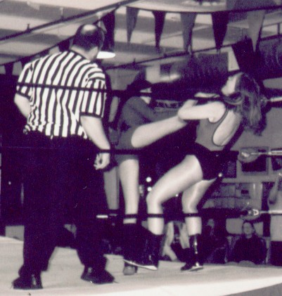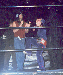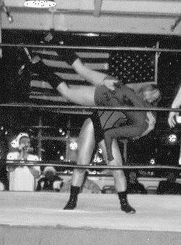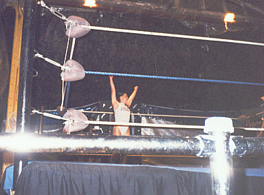 Here I am just hanging out in the ring before the last UWA show. After the kiss you saw last week, I was so enraged, that I was able to dig down deep, and pick up "Strangler" Steve King for a big bodyslam! Unfortunately I was still so mad afterwards, that I attempted to pin the Strangler my standing on his chest. Not an effective way to pin the men's champ, who happens to outweigh me by about 100lbs.