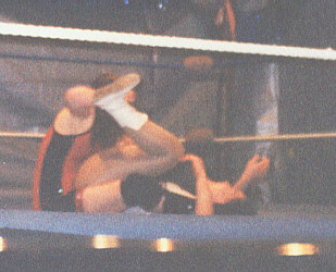 For those fans of mixed action, who've been clamoring for more from the UWA tag team titles tournament, here's a little more. 3 weeks ago or so I had a picture of me unleashing a big kick on Gordy...well, he retaliated by getting me in the corner and hitting me with a big chop!
