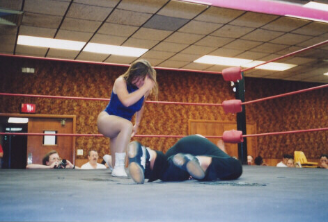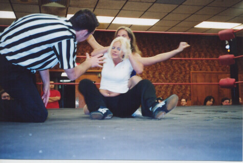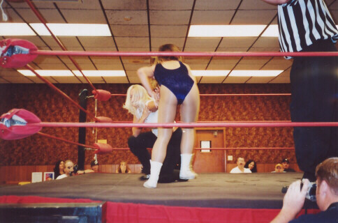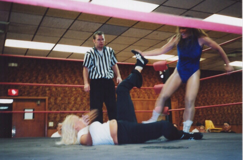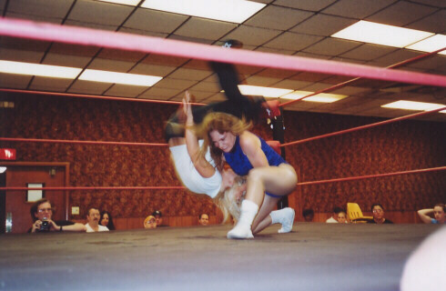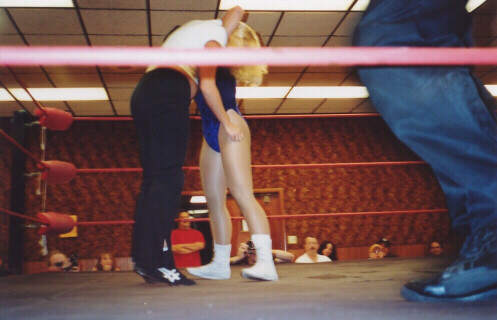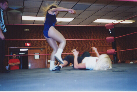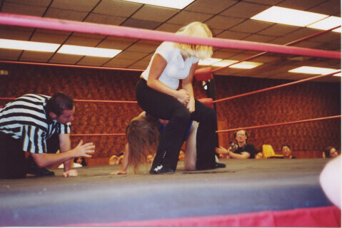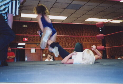 After all that punishment I figured she wouldn't be able to move, so I went to the top (Ok the second, the ceiling was too high to go to the top) rope to finish her off. She had some fight left in her though, becuase she was able to do a handstand and grab me in a headscissors, throwing me off the top! |