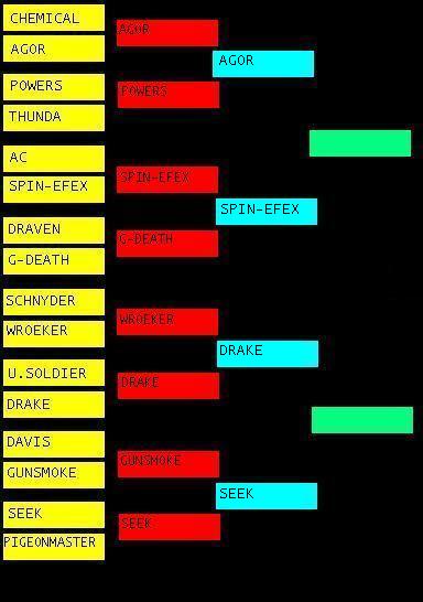 BRUCE: Spin-Efex has won the match and there is a fight going on at the entrance ramp between Schnyder and Universal Soldier while George Agor is unconscious in the ring. Let's move on!!