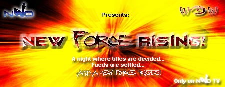 New Force Rising finally comes on the air with a Matrix style opening featuring letters, numbers and coding which merge together forming the nWo logo representing the Netlink Wrestling Organization . In the background you can see a vague logo which reads WOW. All of a sudden, the image rips in half as a silhouette of a man in green walks to the foreground of the screen, carrying a briefcase. He stops and opens it, then throws it at the screen as a gigantic WoW Championship flies out of it and stops, covering the entire screen. The show immediatly cuts live to inside the MCI Center in Washington, DC.. The fans cheer and hold up their signs as they see themselves on the gigantic wraparound screen which sits ontop of a long silver stage. The stage features darkgreen lazer lights moving back and fourth over two smaller screens resembling large computer monitors. In the foreground, 13 Stitches is there playing "Side of Lies"