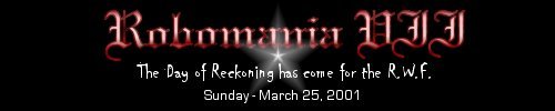Dav: Well Heeellllooooooo Robo fans. Today we'll be having a great fuckin card. We have Vanity trying to prove his worth after a 5 match winning streak against the hottest wrestler in wrestling today Bryan Woods. That should be one helluva matchup, not to mention for the Second time in a row X vs. G.A.P. in the main event(The crowd explodes). I'll be in the middle of these 2 monsters trying to hold them back, but now lets get this party started...LET THE ASSKICKING BEGIN!!!!
