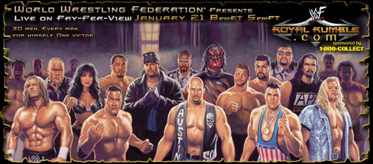 Jim Ross:"One of the most anticipated events in TWF history is finally upon us as we are live from the Pepsi Center in Denver, Colorado for the Royal Rumble. Thirty men are gonna battle it out tonight for a spot in the title match at Wrestlemania King".