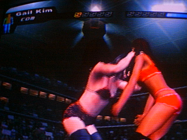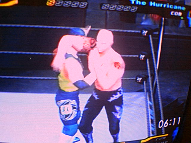 On the hanging monitor, footage from Doomsday is shown when Victoria interfered and Triple H used a sledgehammer.