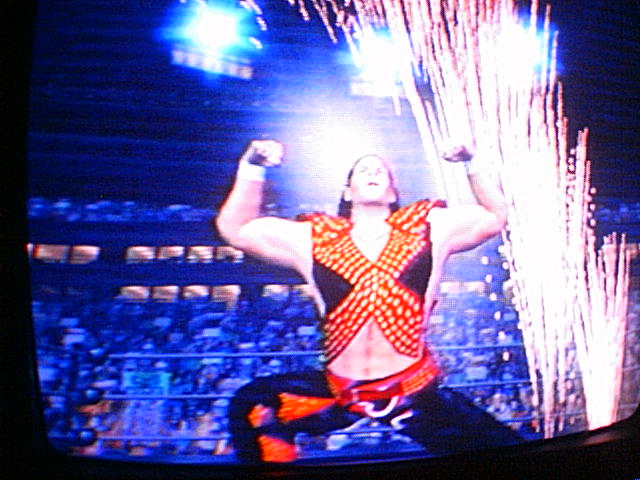 THE BRADLEY CENTER COMES INTO VIEW AS THE FANS INSIDE ARE STANDING IN CHEER OF THE START OF THE EVENT, FILLED WITH LOUD PYRO, COLORFUL FIREWORKS AND THE BLARING THEME MUSIC. THE CAMERA TRIES TO GET A GLIMPSE OF SOME OF THE SIGNS THAT ARE OUT IN THE CROWD AND ONE SAYS "LATINO HEAT WILL TAKE OUT THE AMERICAN CHEAT" AND ANOTHER CREATIVE ONE HAS A DRAWING OF SAM WILDE SITTING ATOP THE RAW LOGO WEARING THE KING OF CABLE TITLE BELT WHILE READING THE BIBLE.