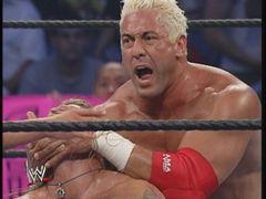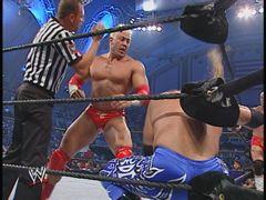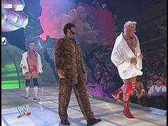 Hardcore spreads Billy out on the ropes while Val cheers him on.