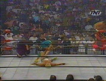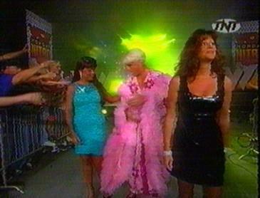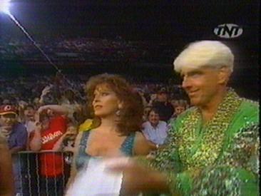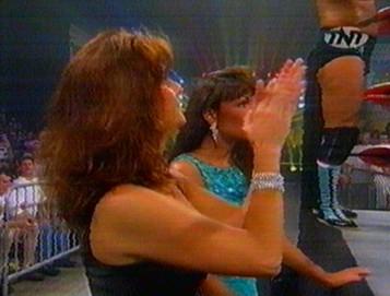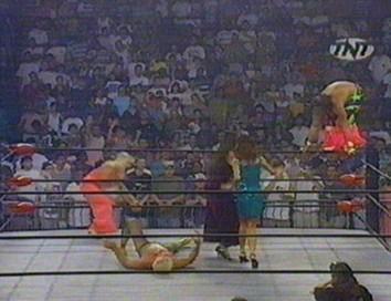 After The Great American Bash, Debra was added into the mix, which kinda diluted Liz's involvement. Shortly after Liz was moved to the nWo. Liz is quite active in the second of the two events which makes a welcome change. Savage is going through his "mental" phase where he chased Flair everywhere. He also chases Liz and the other woman around the ring for a while, but receives a slap from Liz for his trouble. As Randy is about to win the match with his infamous flying elbow, Liz, Woman and Debra jump in front of Ric. Savage, being savage jumps anyway and the women go a running!