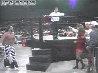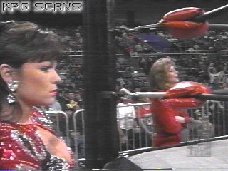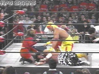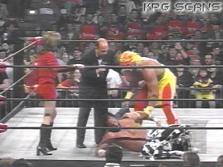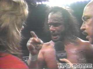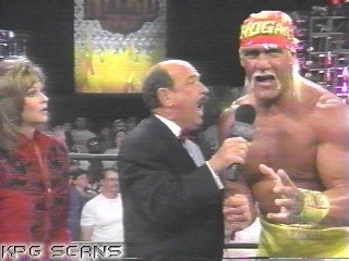 This is Elizabeth's second appearance at WCW Nitro. The match is Ric Flair vs. Macho Man, who is accompanied to the ring with Liz and Woman. This is the second week of Liz and Randy's pairing together and as history show it was their last for more than a year. During the match Woman turns on Savage and attacks him from behind. At the end of the match Hulk Hogan comes to the ring and gives an interview. Ric Flair and The Giant attack him from behind. When Hulk and Savage regain consciousness, they ask Elizabeth why she didn't warn them, when she could see them sneaking up behind them.