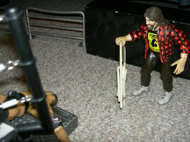 Shane: Oh my gosh! Cactus just drove that chair into Rock's skull.