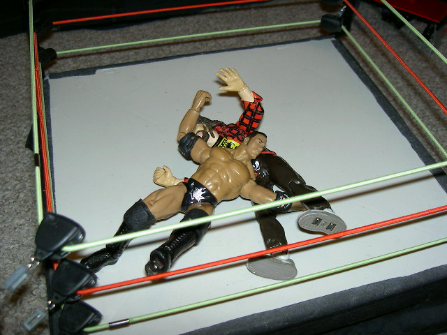 Shane: The action spills back into the ring, and Rock drills Cactus to the mat with a samoan drop.