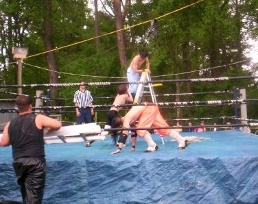 Skyy climbing the ladder to jump on Roberts and Lavaro