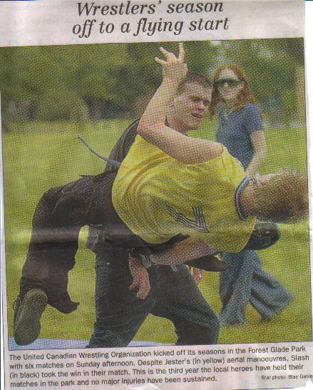 ![]() ![]() FIRST WEEK SUCCES! UCW IN THE WINDSOR STAR! 2 WRESTLERS CUT!No, not the wrestler. UCW made the second page of the Windsor Star today. Jester, Slash and La Tigra were featured in the photo. There will be updates later tonight with updated stats, and the final 4 bios. Red Dragon and Eclypse have been cut from the season and replaced by Genoside and Hardcore Brian. I would like to welcome those 2 to the Hollerific Division. Check the site tonight or tomorrow for the updates!!!