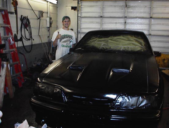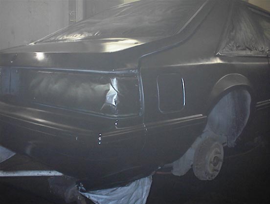 We got the paint from Larry @ Weaver's Auto in Madison, WV. He mixed up a batch of custom paint that only he makes, we call it "Larry" Black. Creative, huh!! After a GOOD bit of body work on the hatch (I must admit, it was much more than I expected) and a couple other spots on the car ("that damn hole just kept gettin BIGGER & BIGGER!!"... LOL), we finally got around to actually painting the car. Boog sprayed 2 coats of basecoat & 3 coats of clear coat!